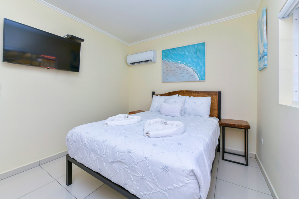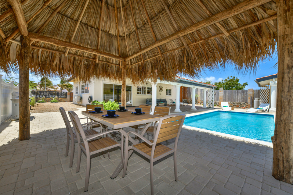 Outside, the villa truly shines! The spacious backyard features a brand-new swimming pool surrounded by sun loungers for soaking up the Aruban sun. There’s a shaded lounge area for relaxing in comfort, and a large palapa that’s perfect for outdoor dining. Also, there is a BBQ grill for delicious cookouts, and a laundry room equipped with a washer and dryer for your convenience. The entire property is fully fenced, offering privacy, safety, and peace of mind throughout your stay.